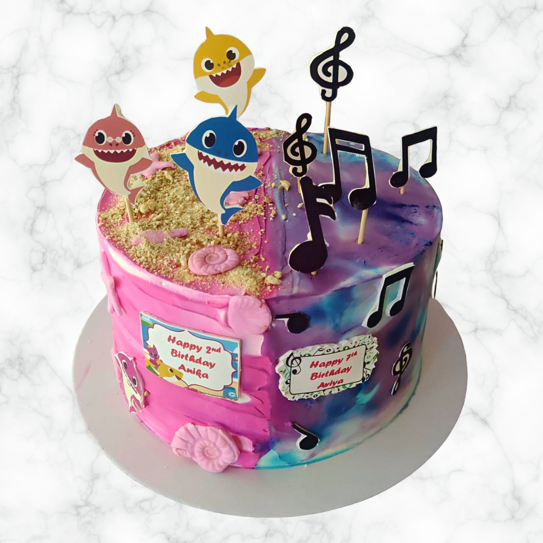 This unique cake combines two worlds of fun! Entitled A Musical Shark Surprise!, it features a playful split design for the music lover and Baby Shark enthusiast.