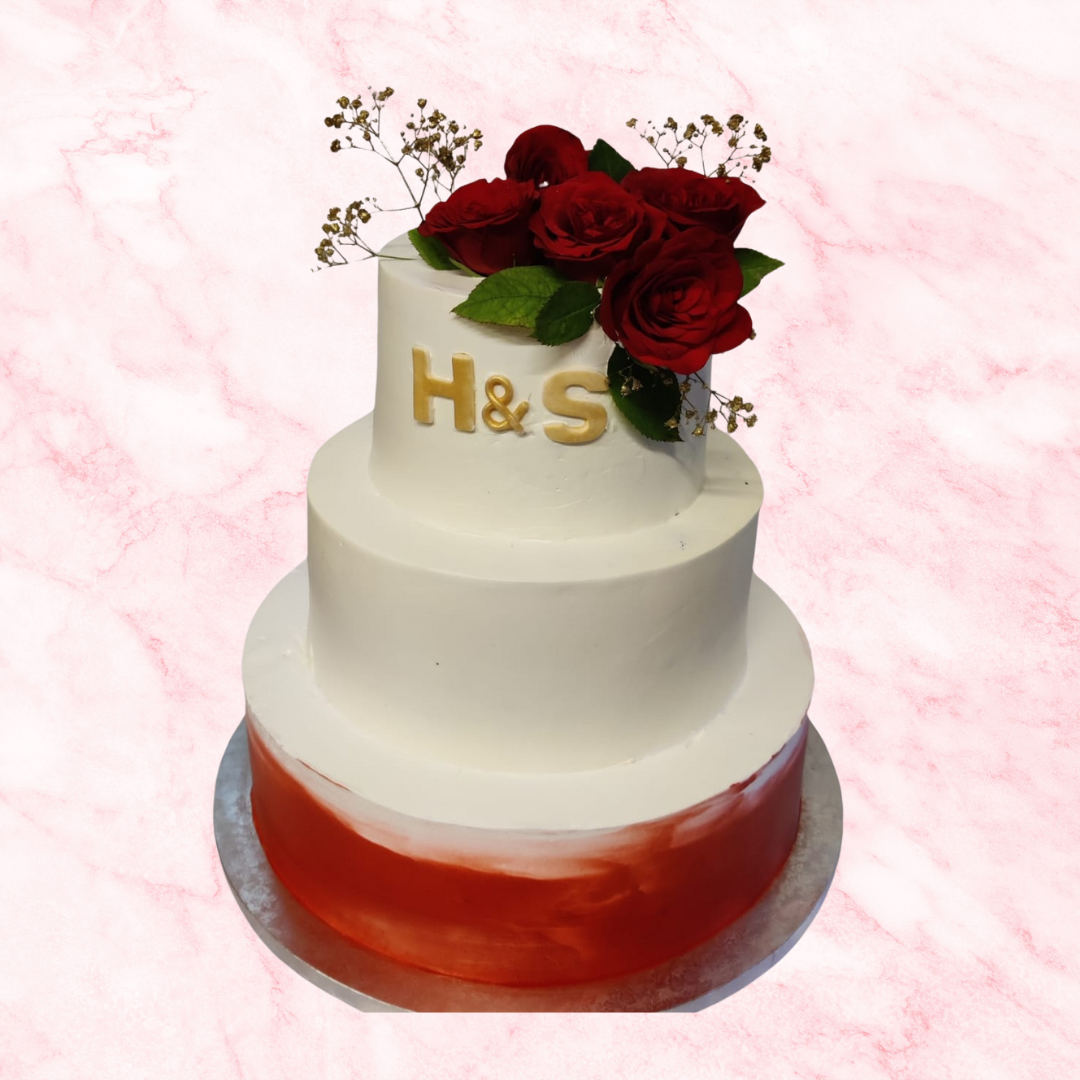 Imagine a delightful three-tiered cake, each layer adorned with a smooth, classic frosting. Cascading down the sides are beautiful roses in various colors, symbolizing the couple's love story. Delicate green leaves add a touch of nature's freshness.