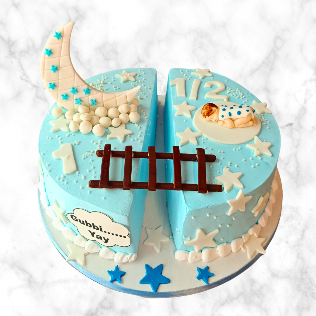 Celebrate a special half-birthday with this dreamy blue cake! Decorated with a crescent moon, stars, and a cute fondant baby, it features a unique 1/2 design perfect for marking the milestone.