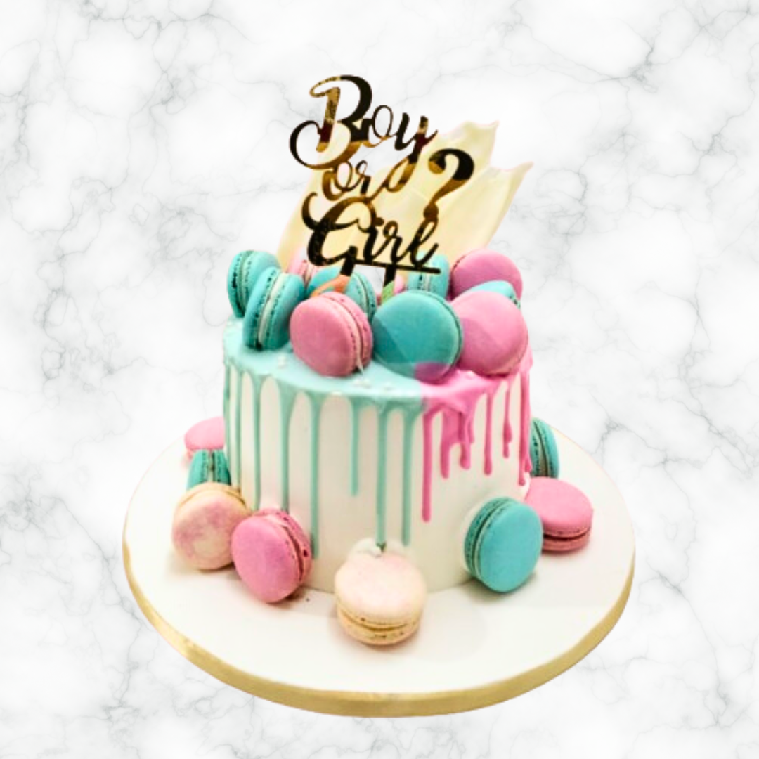 Indulge in our Baby Shower Macaron Overload Cake - a playful twist on a traditional baby shower treat. This cake is overloaded with delicious macarons in shades of pink, blue, and white, adding a touch of sweetness and whimsy to any celebration. A true delight for your taste buds!