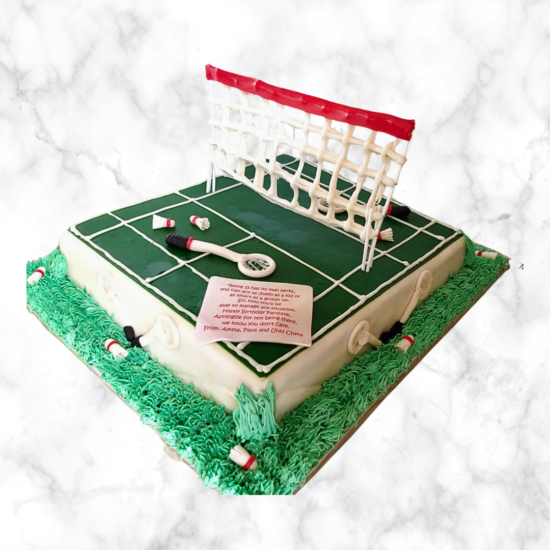 A creatively designed rectangular cake mimicking a badminton court, complete with a 3D edible net, scattered shuttlecocks, and racket detailing. Perfect for any badminton lover's birthday bash!