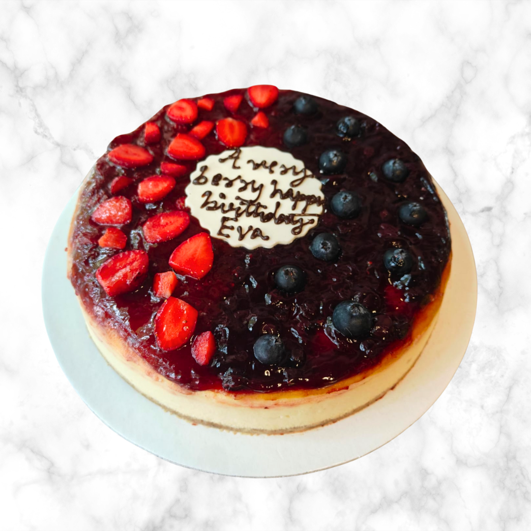 A luscious Berry Cheesecake featuring a velvety cream cheese base, swirled with vibrant berry compote and topped with a medley of fresh, juicy berries. Perfectly indulgent!