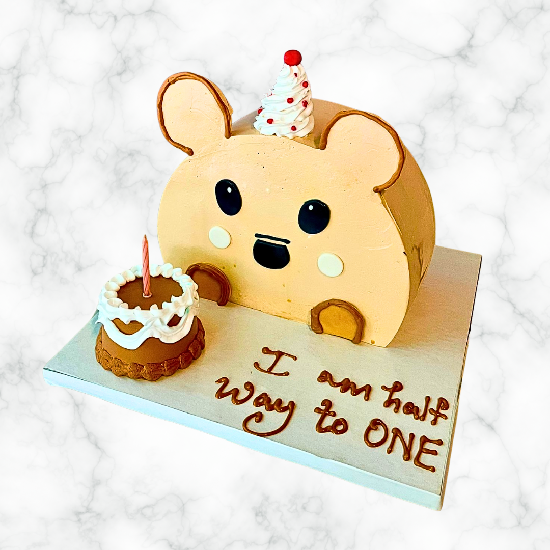 Celebrate your baby's six-month milestone with our adorable "Halfway to One" cake featuring a charming rabbit-shaped cake half. This unique and creative design is perfect for a baby shower or half birthday party, making it a memorable treat for both parents and guests.