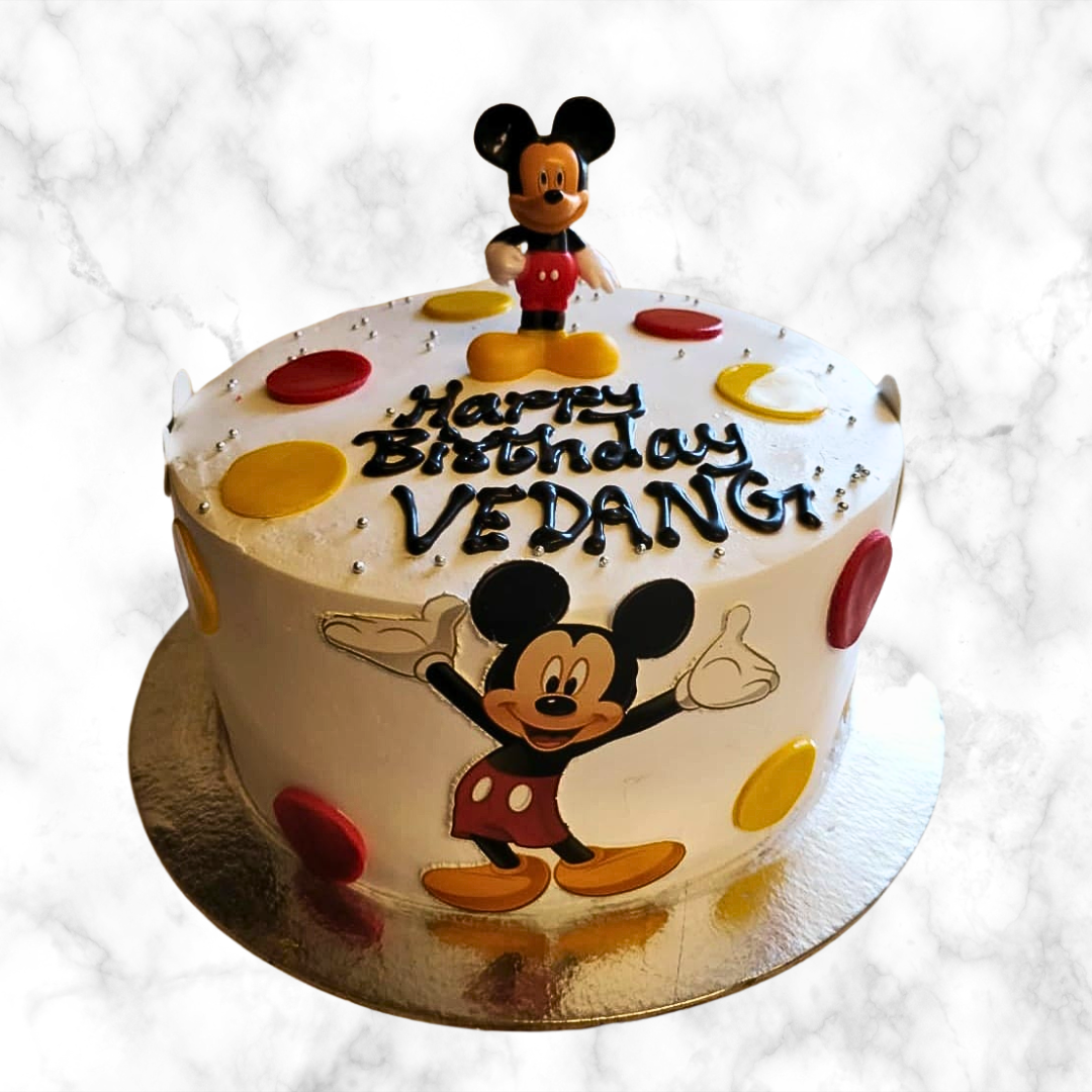 Bursting with joy and dotted with playful colors, this classic Mickey cake features a charming topper and cheerful design—perfect for a timeless birthday celebration!