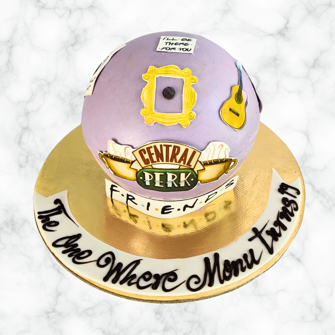 A spherical shaped cake with symbols such as central perk, peephole frame and more from the popular sitcom F.R.I.E.N.D.S.