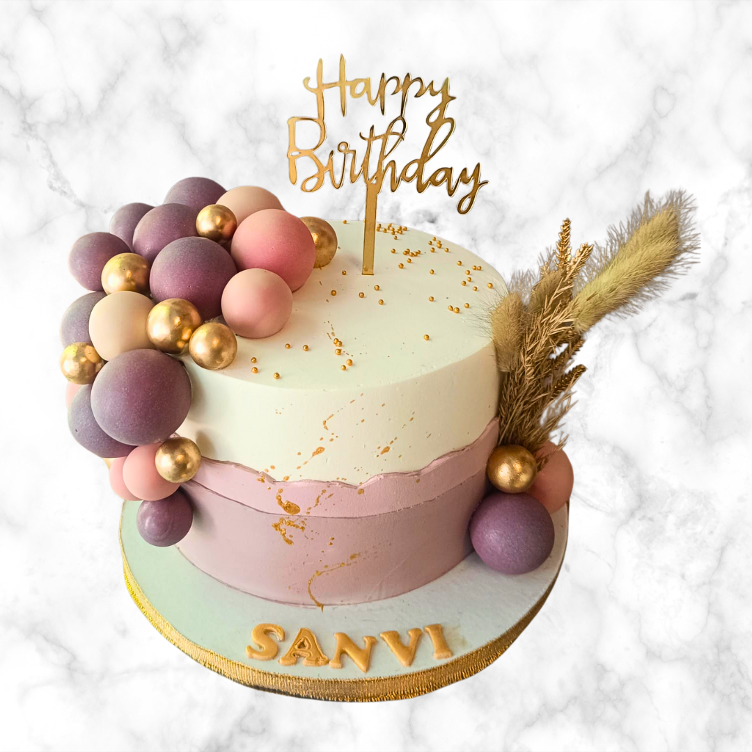 A stunning white and purple fade birthday cake adorned with pink, purple, and white decorative balls. Perfect for adding a touch of elegance and charm to any celebration!