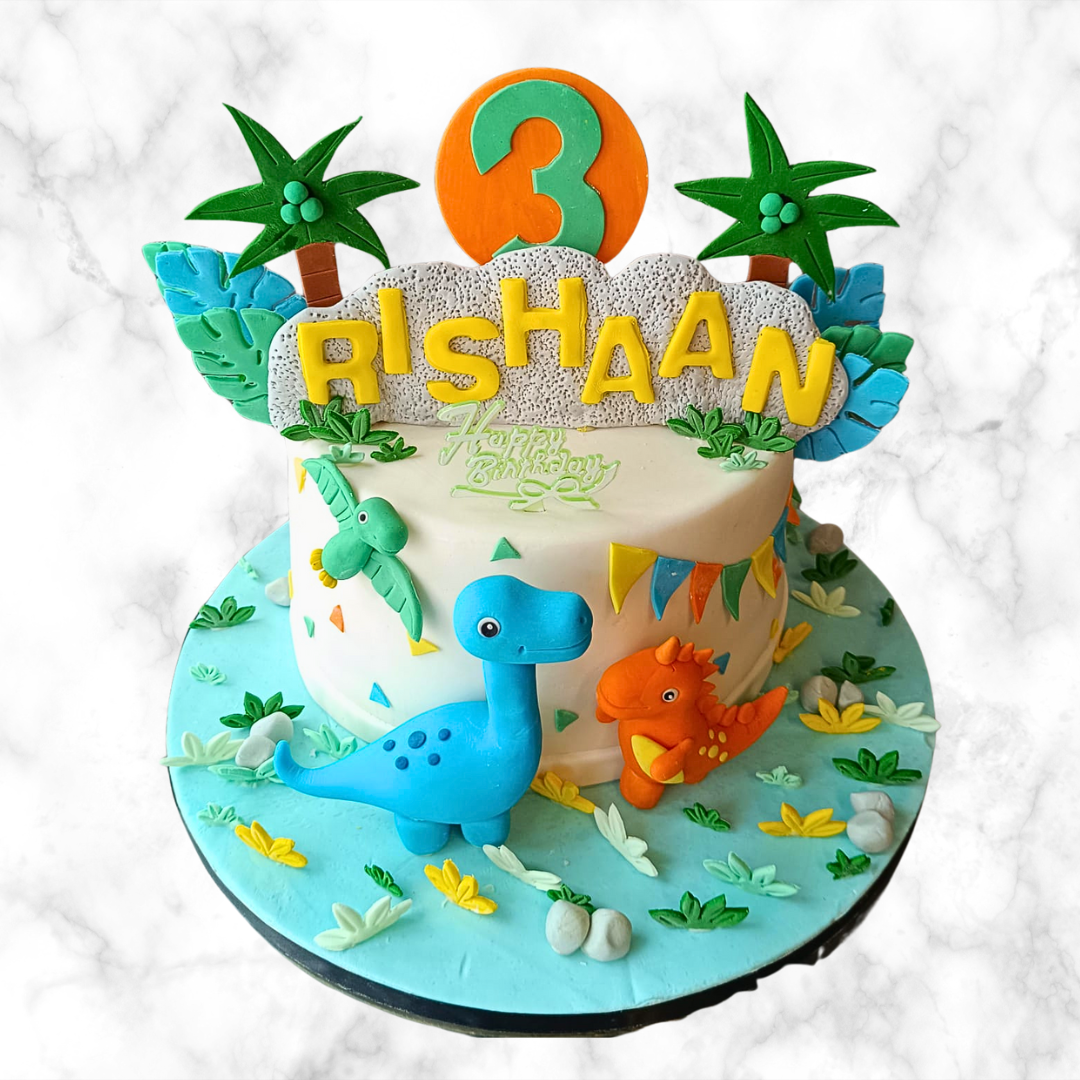 A prehistoric adventure awaits with this vibrant coconut cake featuring colorful dinosaurs and lush green leaves.