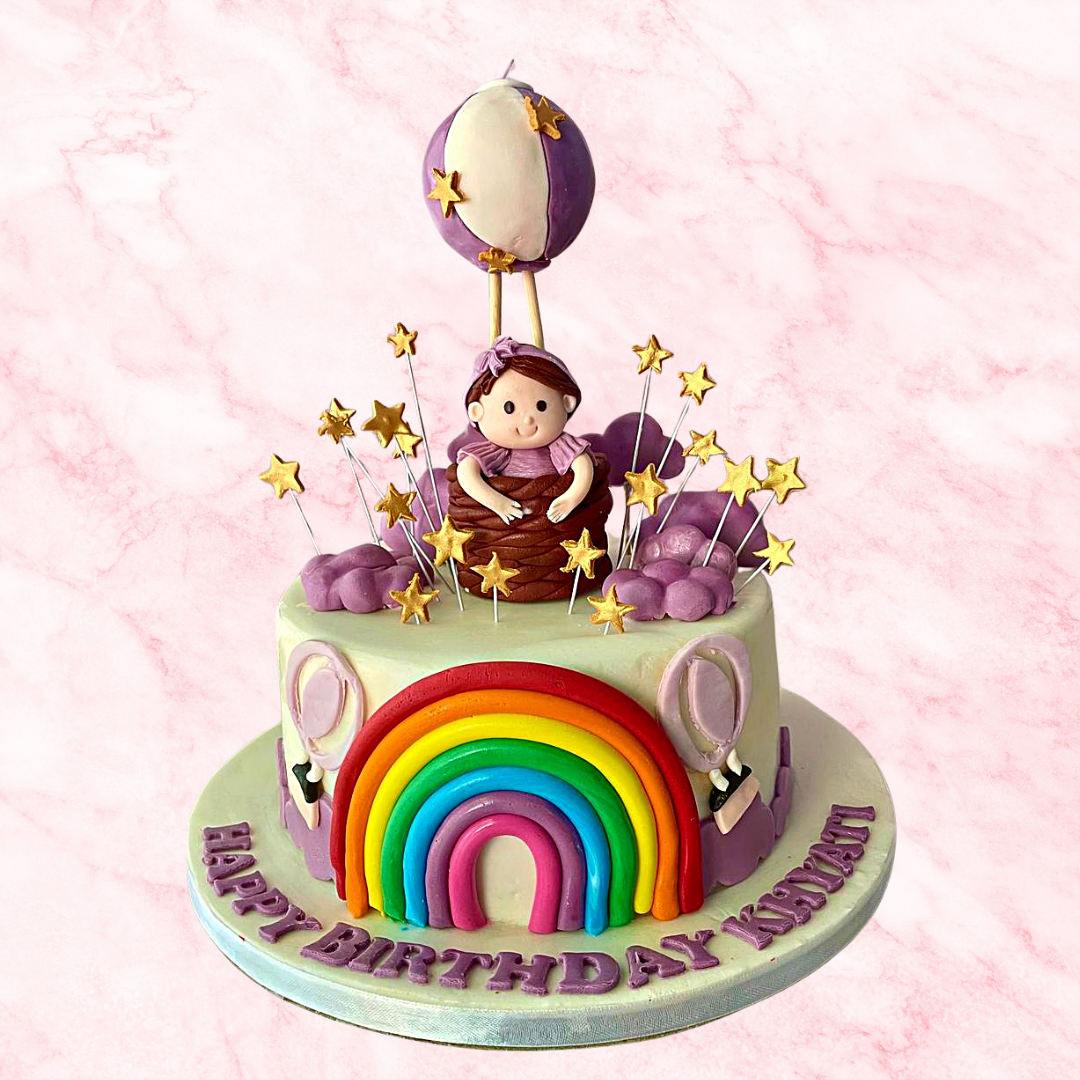 This whimsical cake captures the magic of childhood dreams! A vibrant rainbow arches over a frosted cake, with a charming girl figure nestled in a colorful hot air balloon ready to soar. It's a delightful centerpiece for any celebration.