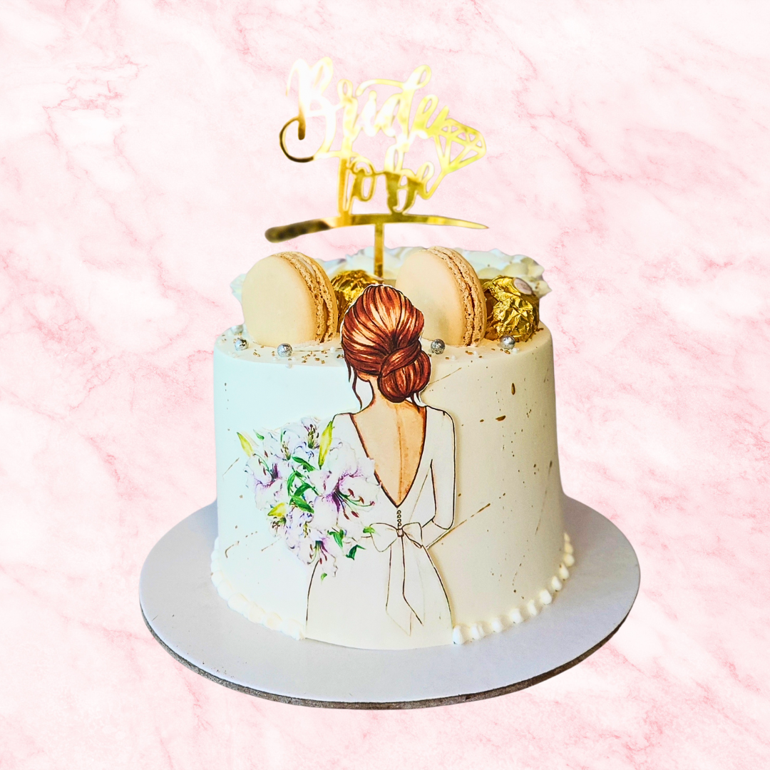 Get ready to fete the soon-to-be Mrs. in top-notch fashion with our elegant bride to be Cake topped with rochers, macarons and Bride to be topper!