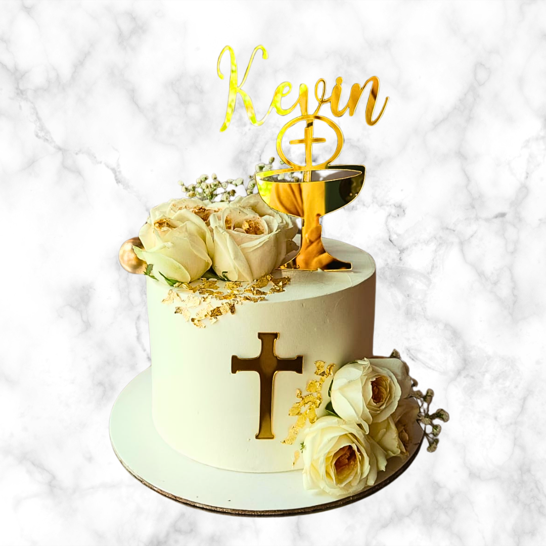 A pristine white and gold cake adorned with delicate fresh roses, golden crosses, and a symbolic chalice topper—ideal for first communions, christenings, or baptism celebrations. A graceful blend of faith and festivity.