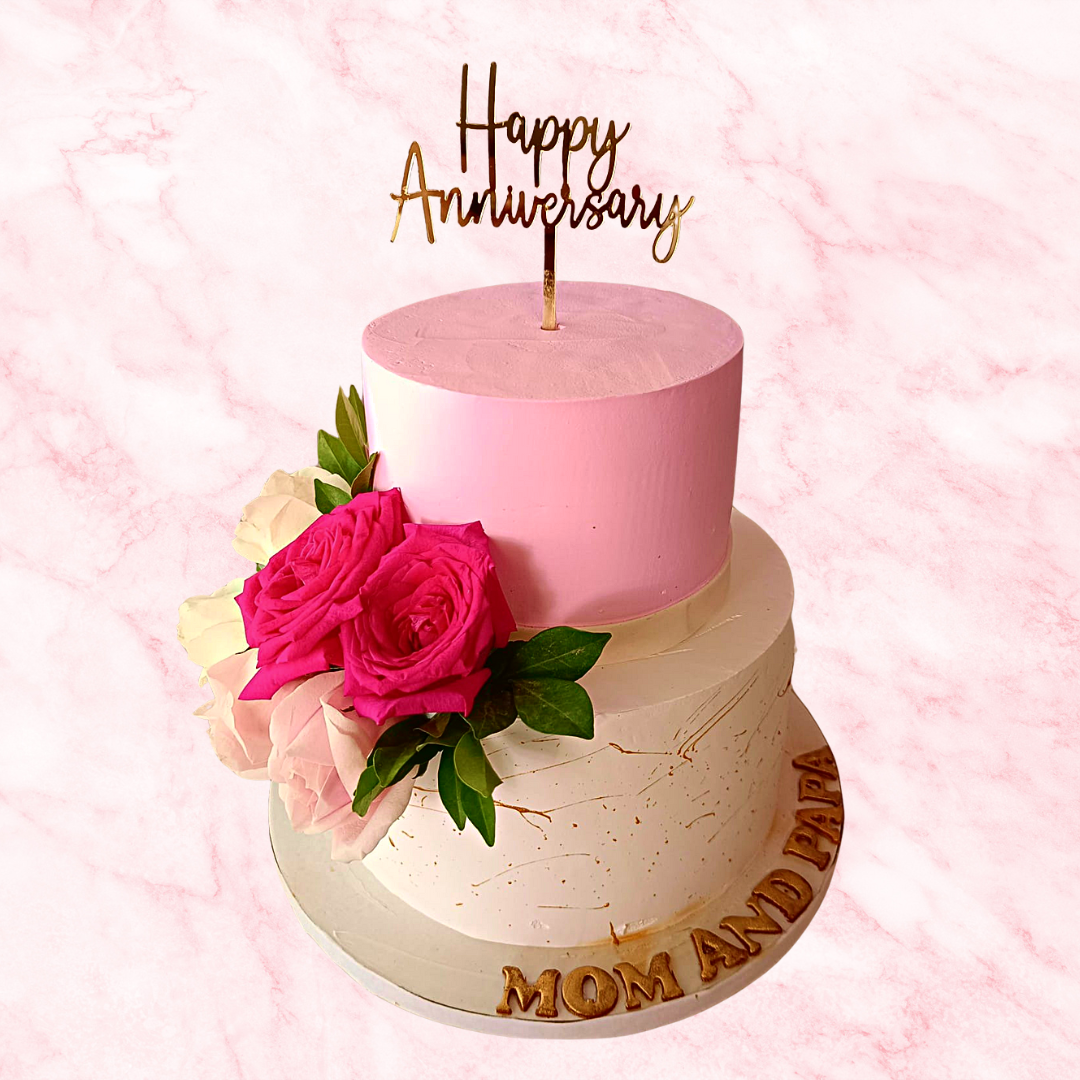 Celebrate your parents' enduring love with a timeless and elegant cake in Enduring Love Blooms: A Classic Two-Tier Anniversary Cake for Mom & Dad! This beautiful two-tier cake features a simple design adorned with roses, creating a heartfelt centerpiece for their special day.