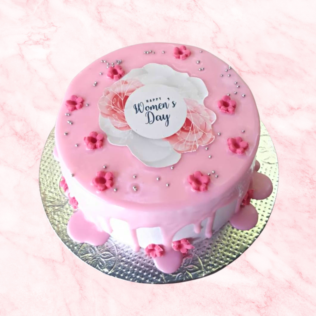 This vibrant cake features diverse flowers blooming together beneath silver sprinkles, reflecting the message of "Blooming Sisterhood." Celebrate the unique beauty and strength of women supporting each other.