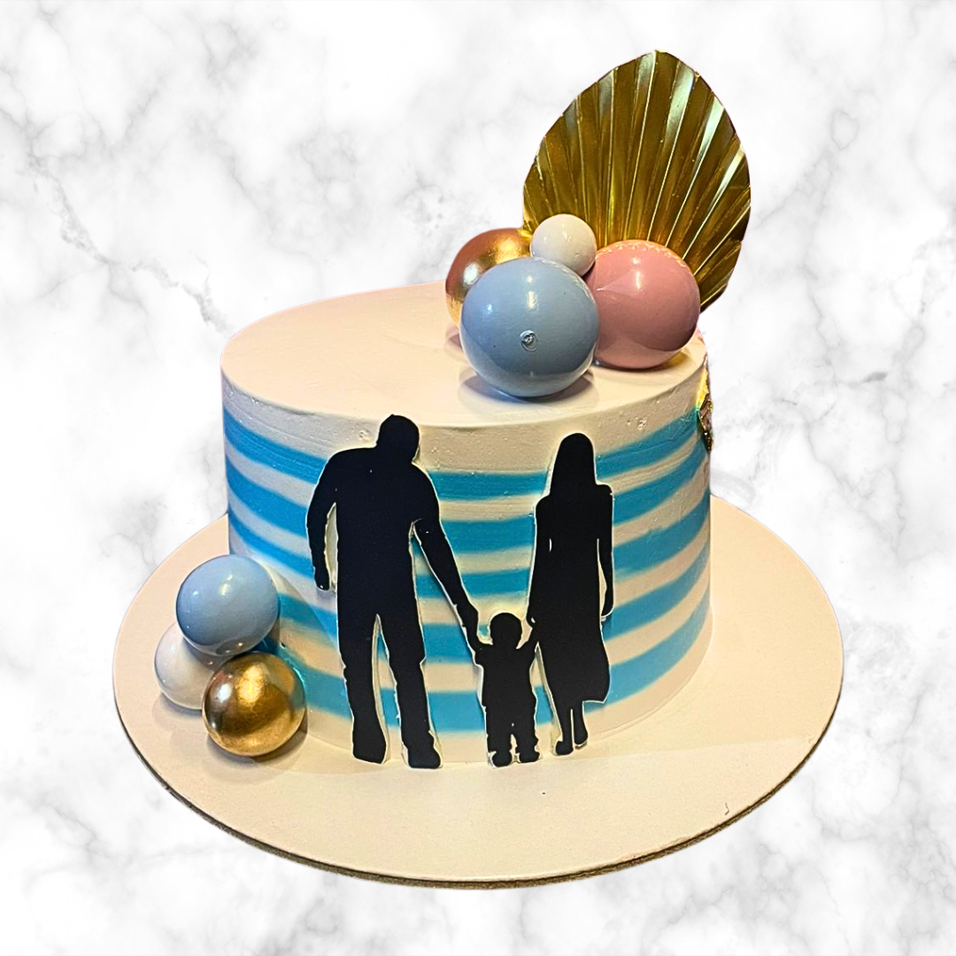 Celebrate the bond of togetherness with this elegant family-themed cake. Featuring a striking silhouette of a family holding hands, soft pastel accents, and a touch of gold, this cake beautifully captures love and unity.