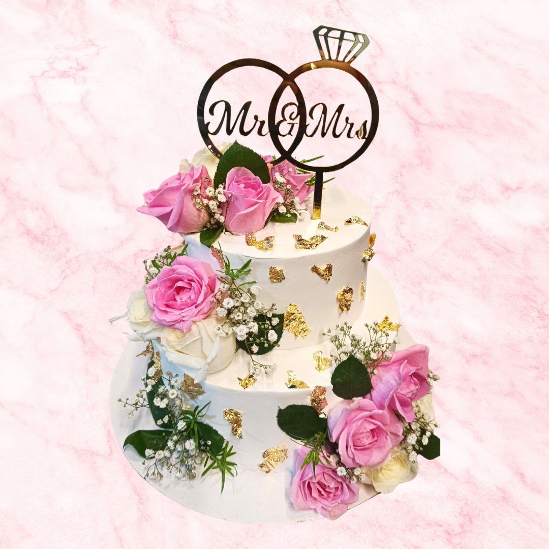 This elegant cake captures the essence of a loving union! Entitled Gilded Love Story: A Mr. & Mrs. Rose Gold Dream, it features a sophisticated white canvas adorned with delicate pink roses and a touch of shimmering gold, perfect for a Mr. & Mrs. celebration.