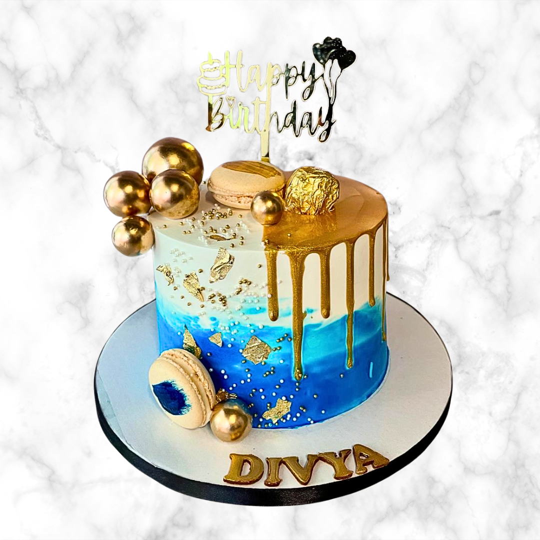A luxurious cake featuring blue ombré shades at the base, golden drip details, and gold macarons. Accented with Ferrero Rocher chocolates and design spheres, this masterpiece radiates elegance and indulgence!