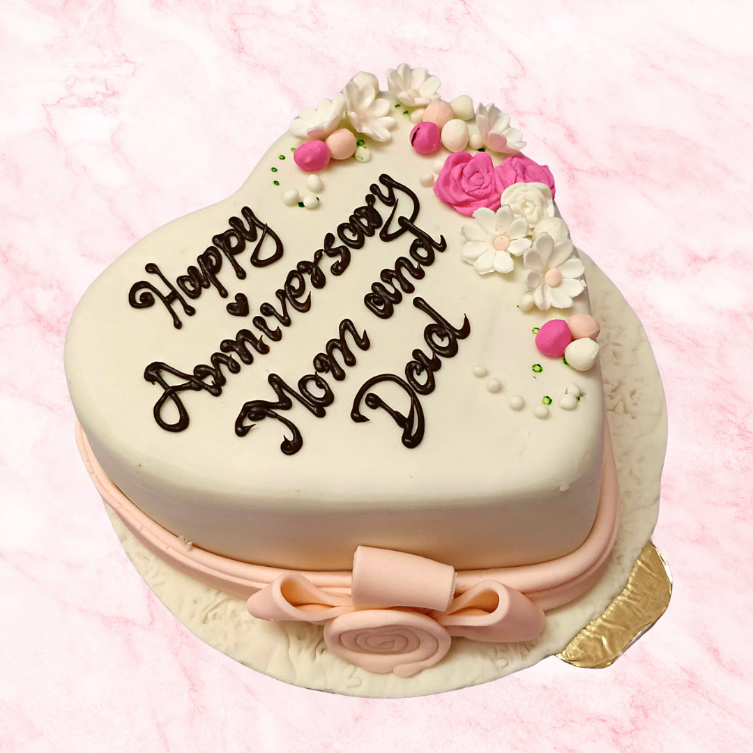 Celebrate the enduring love your parents share with Forever Blooming Love: A Heartfelt Anniversary Cake for Mom & Dad! This charming heart-shaped cake features a touch of elegance and a heartfelt message, perfect for showing your appreciation on their special day.