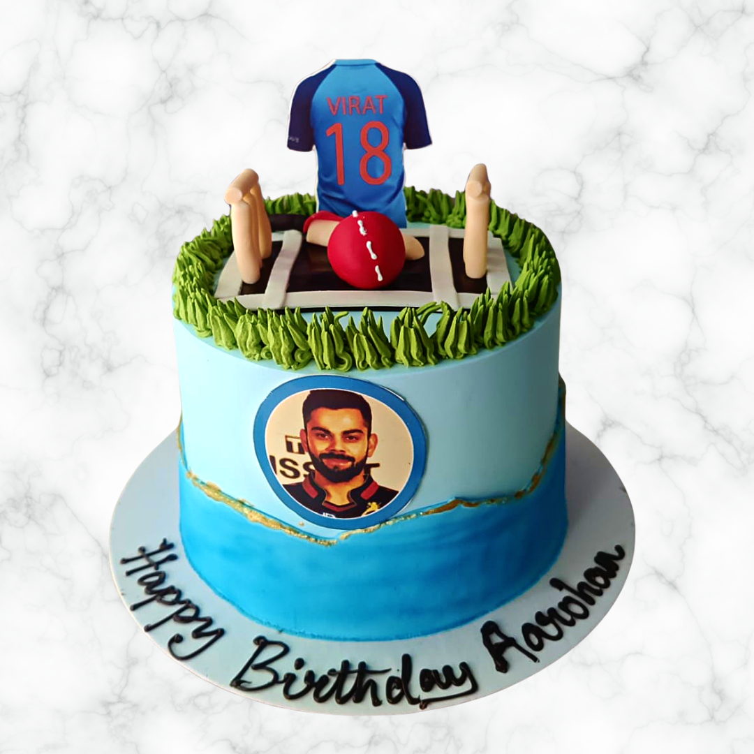 Celebrate your cricket hero with the King Kohli's Champion Cake! This single-tier masterpiece features a vibrant photo of the legendary Virat Kohli, adorned in his iconic jersey, taking center stage.