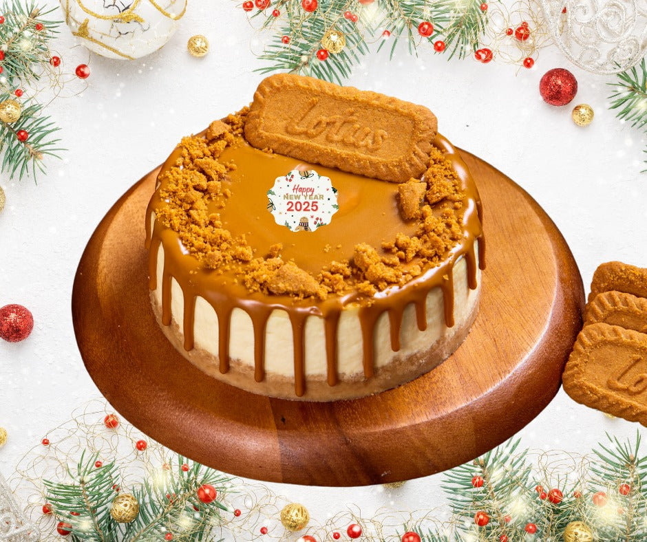 Celebrate the New Year with our luscious baked cheesecake infused with the rich flavors of Lotus Biscoff. A festive treat to savor!