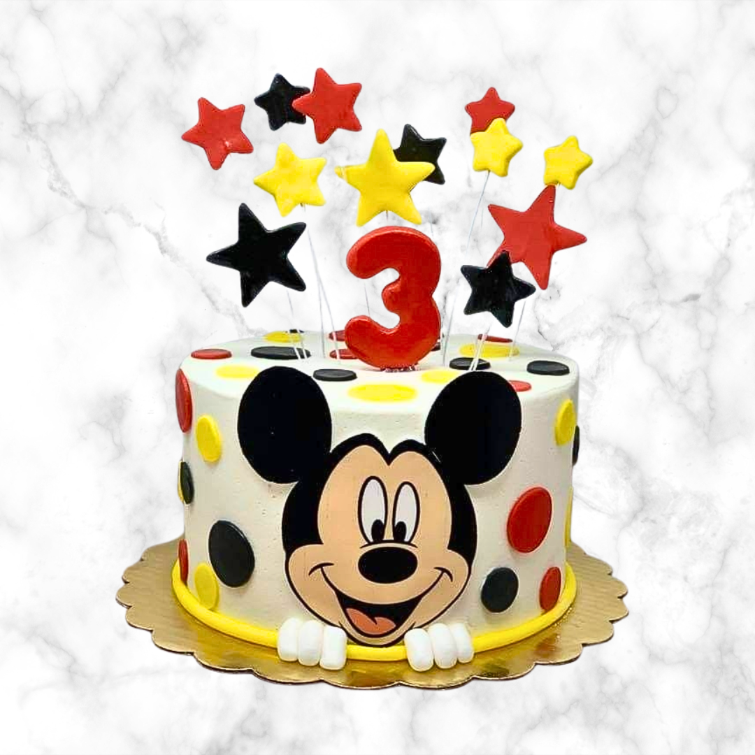 Bright, bold, and full of joy—this polka-dotted Mickey Mouse cake brings birthday dreams to life! Topped with stars and a big red “3,” it’s perfect for your little star’s big celebration.
