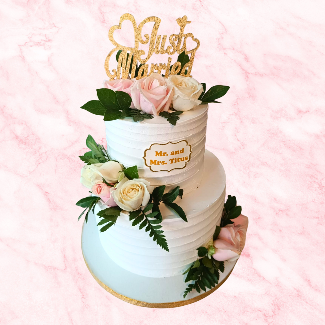 This enchanting cake celebrates the start of a beautiful journey! Entitled Blushing Blooms & Newlywed Dreams: A Just Married Cake, it features a pristine white canvas adorned with delicate pink and white roses, symbolizing love and new beginnings.