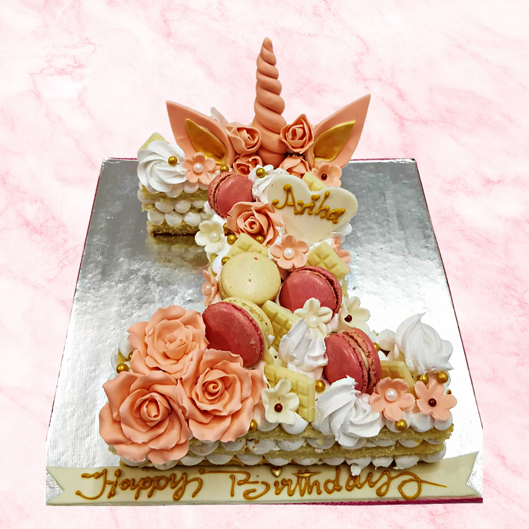 This playful cake combines a birthday celebration with everyone's favorite mythical creature! Entitled A Numberific Unicorn Celebration!, it features the birthday age shaped like a charming unicorn.