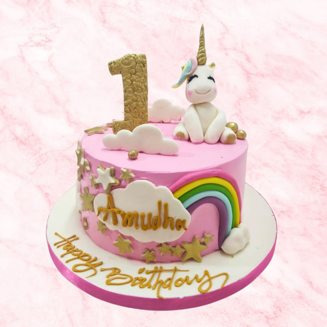This adorable cake celebrates a baby's first magical year! Entitled One-Derful Year: A Baby Unicorn's Birthday Blast!, it features a whimsical baby unicorn design perfect for this milestone celebration.