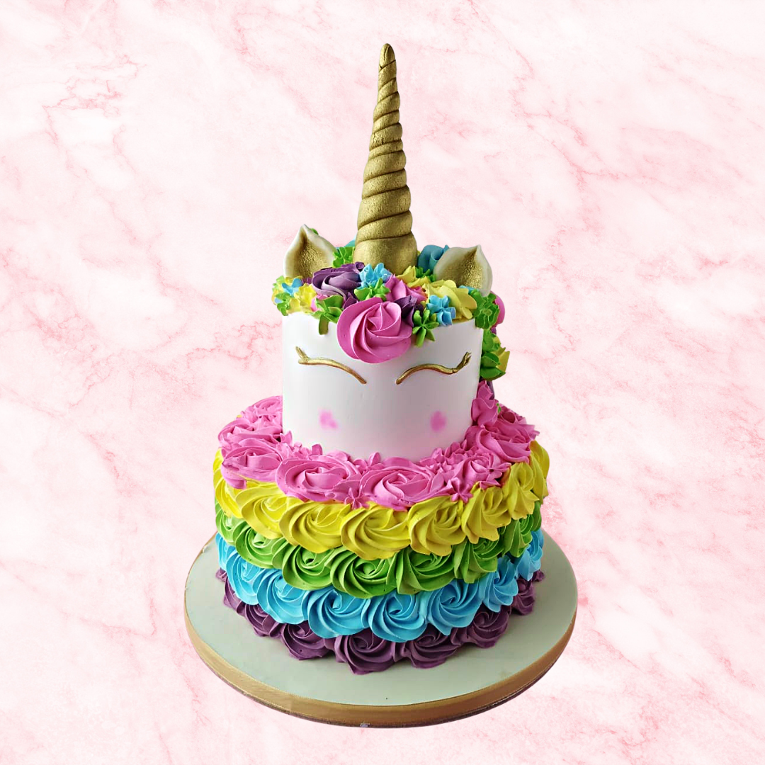 This whimsical cake combines two fantastical elements into a delightful double-decker treat! Entitled Double the Magic: A Rainbow Bloom & Unicorn Dream Cake!, it features a vibrant explosion of color and a majestic unicorn ready to celebrate.