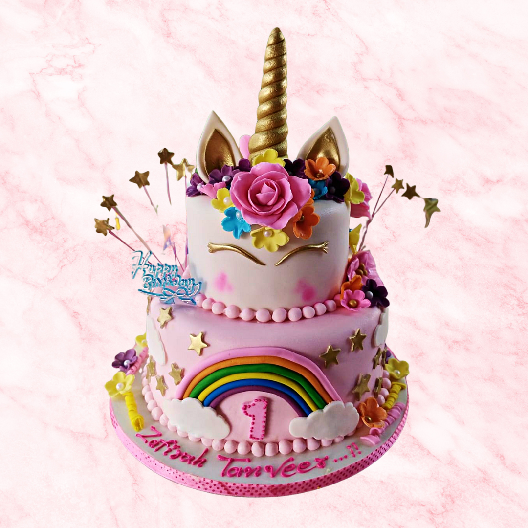 This enchanting cake takes you on a magical journey! Entitled Reaching for the Stars: A Rainbow & Unicorn Dream Cake!, it features a majestic unicorn soaring through a fantastical sky filled with dazzling stars and a vibrant rainbow.