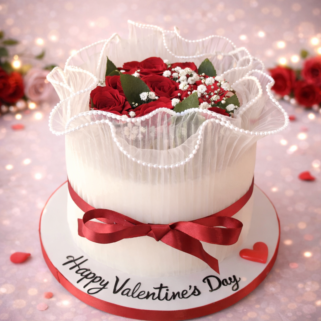 A soft white cake wrapped in delicate pleated detailing, crowned with fresh red roses, baby’s breath, and pearl accents—finished with a deep red ribbon for an elegant, romantic touch.