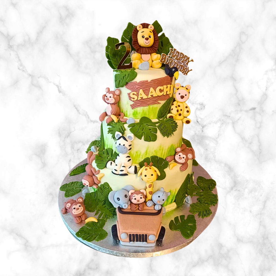Embark on a whimsical safari with this jungle-themed cake! Featuring playful animals, including a lion, zebra, giraffe, and even an animal driving a car, this cake is a whimsical masterpiece for any adventurous soul.