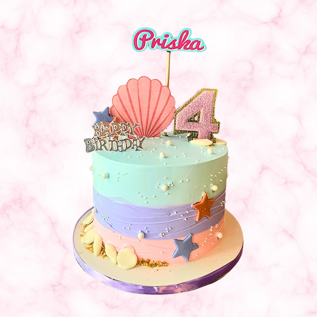 This elegant birthday cake is adorned with delicate silver balls, seashells, and sparkling stars, bringing a touch of ocean-inspired magic to your special day. A sweet, serene creation for any celebration!