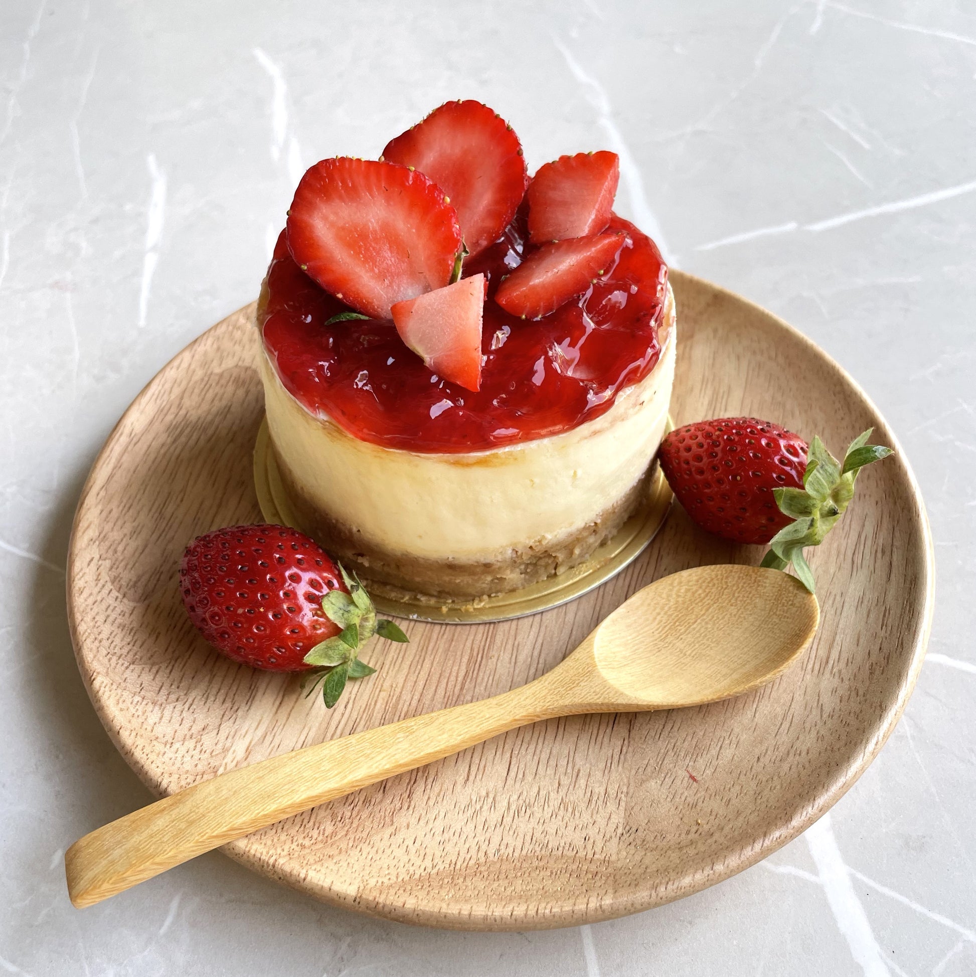 Creamy baked cheesecake with a buttery flaky crust topped with strawberry compote and fresh strawberries.
