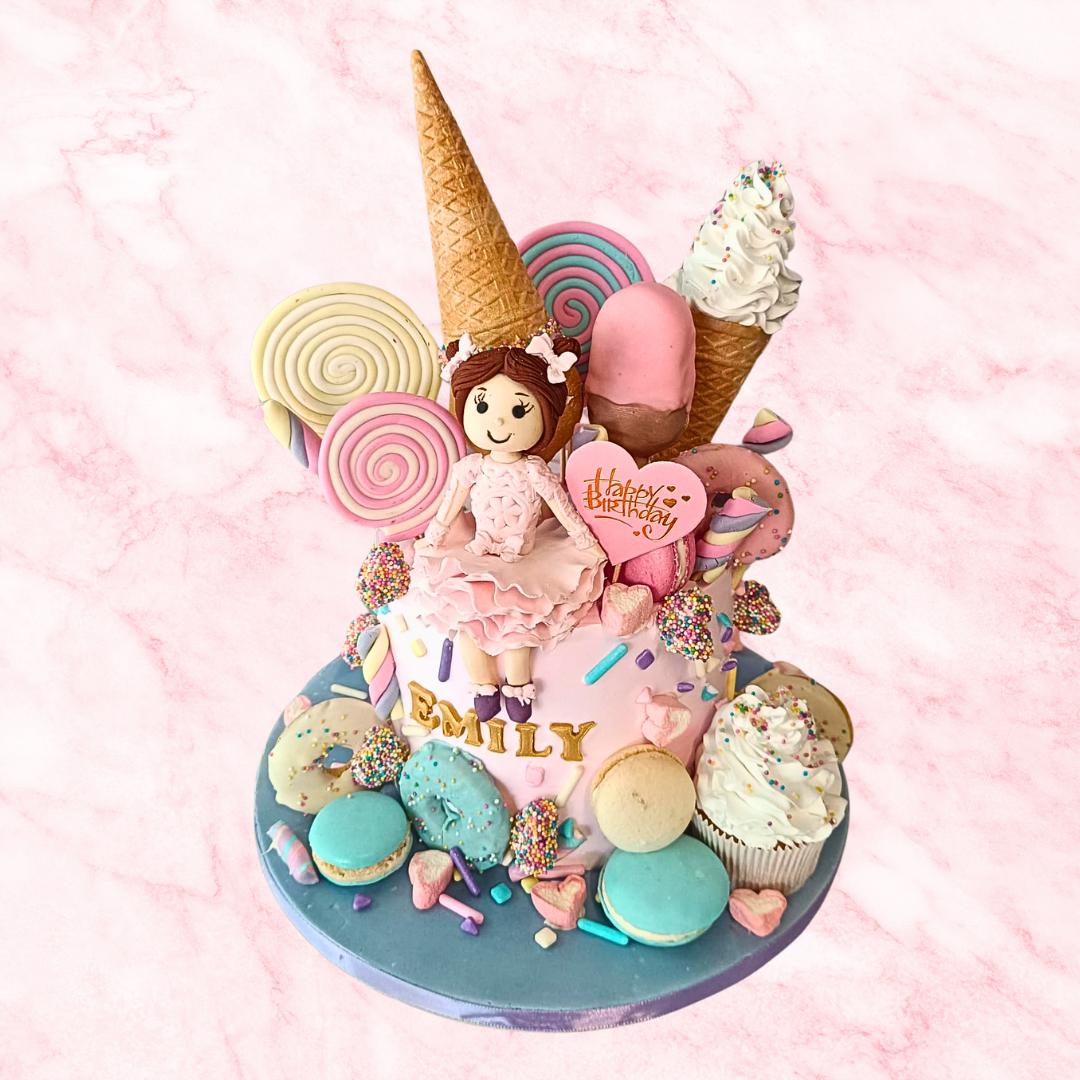 This "Sugar Rush Surprise" cake is a guaranteed hit for any doll enthusiast with a sweet tooth. The cheerful frosting, the charming doll, the overflowing treats, and the optional touches come together to create a visually stunning and delightful centerpiece that will make their birthday a sugary dream come true!