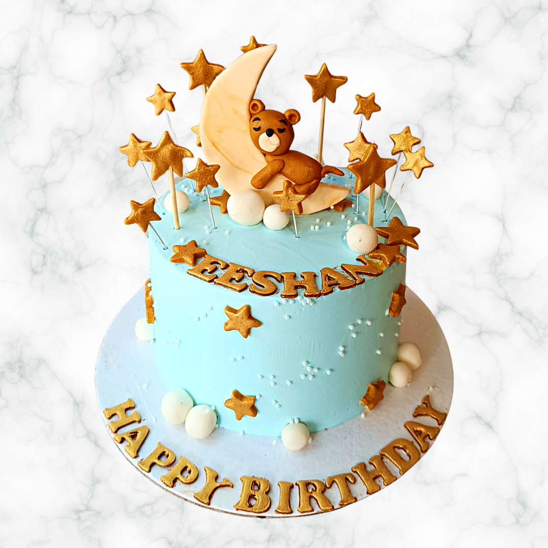 This whimsical birthday cake is sure to bring a smile! A sleepy Bear, crafted from fondant, rests peacefully on a crescent moon made of cake. Twinkling stars made of frosting or edible glitter surround them, creating a magical dreamscape.