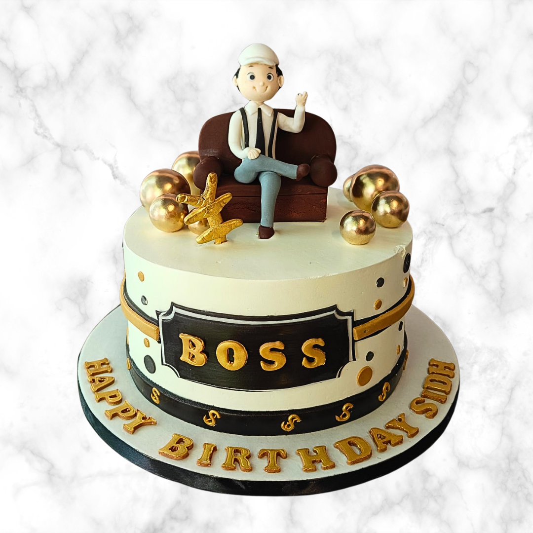 Here’s to the man in charge! This classy cake brings boss vibes with golden glam, a mini-me topper, and serious style.