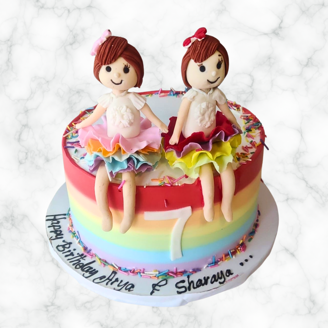 Celebrate double the joy with this delightful cake for twin sisters! Imagine a classic single-tier cake transformed into a charming tribute to two special individuals.