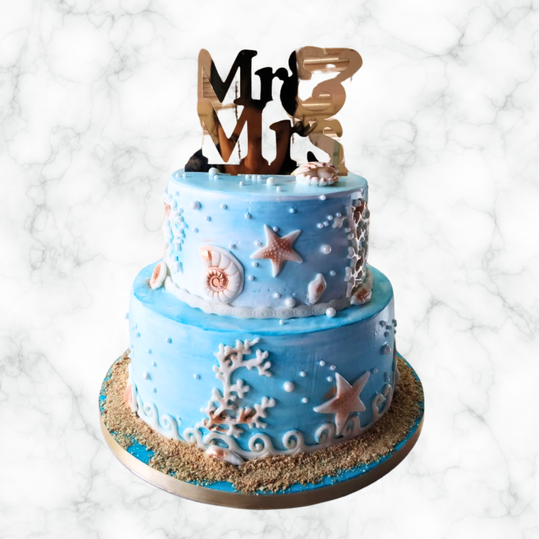 This whimsical cake dives into the joy of your special day! Entitled Underwater Love: A Mr. & Mrs. Ocean Adventure, it features a unique underwater theme, perfect for a couple who loves the sea.