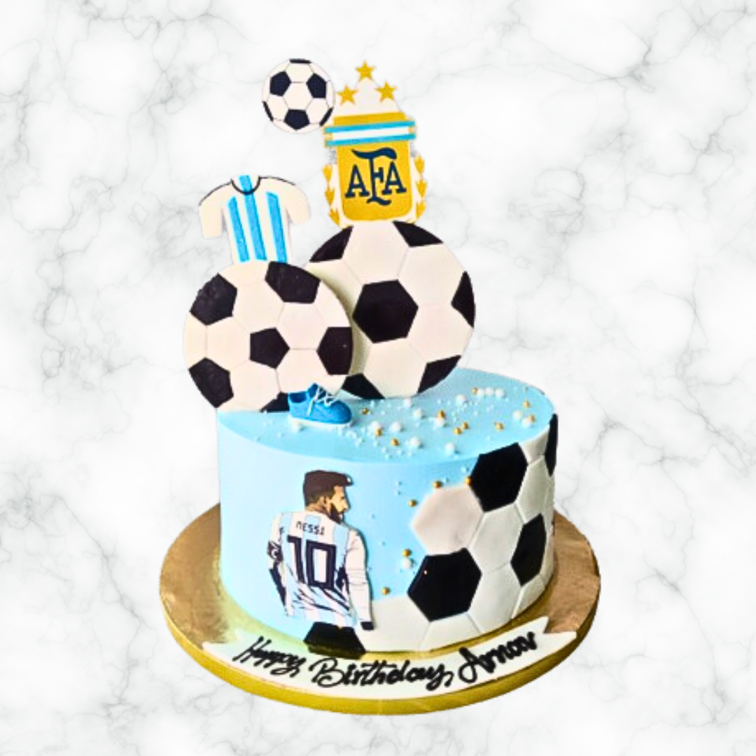 Score a goal with this 'Messi'-themed victory cake! Perfect for any fan of the legendary football player, this cake will surely be a winner at any celebration. Don't just watch the game, taste the victory with this delicious and fun cake. (Mmmmmessi!)