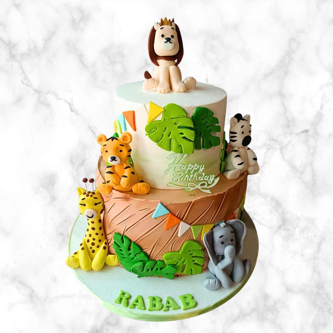 This vibrant cake is a jungle adventure for the taste buds! Decorated with a majestic lion, playful elephants, zebras, and a tiger, this cake is perfect for any animal lover.